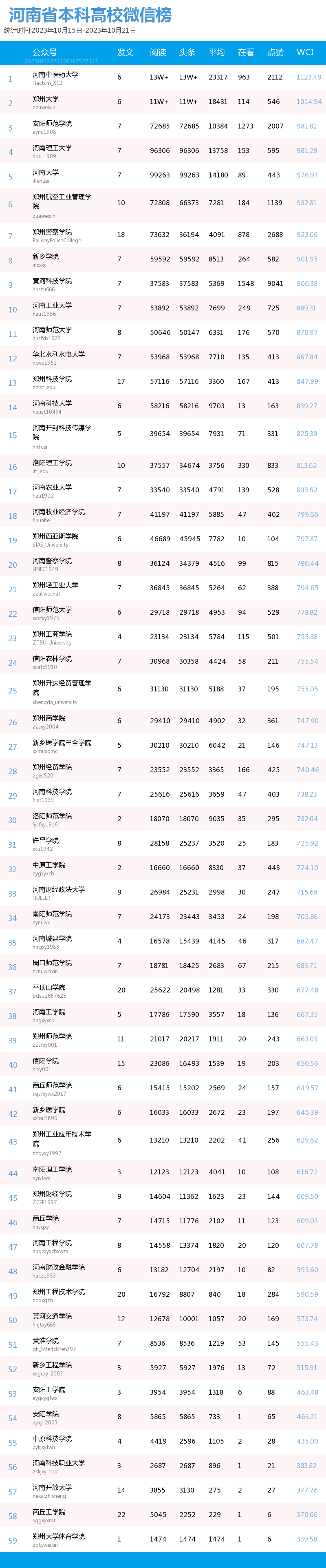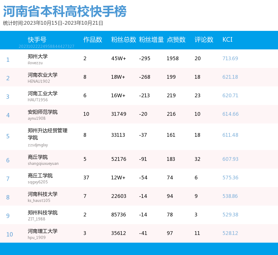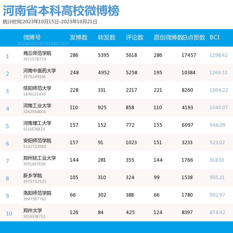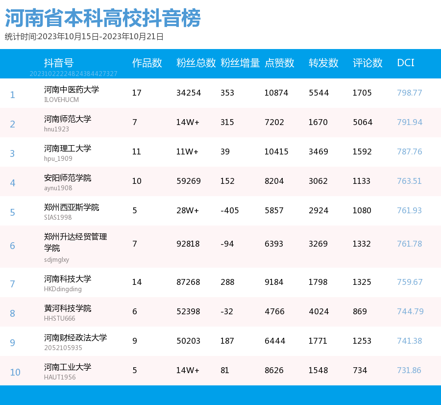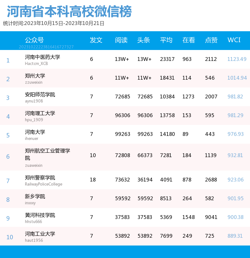 新媒 |(10.15-10.21)河南省本科院校综合传播力TOP10(附总榜)教育 | 新媒体 | 舆情 河南省教育新媒体暨舆情研究中心 河南省教育新媒体暨舆情研究中心采用第三方平台(清博指数)监测到的数据,按类别对10月15日-10月21日河南省本科院校微信、微博、抖音、快手综合传播力进行排名并整理发布。 河南省本科院校官方微信WCI ![]() 本周河南省本科院校官方微信WCI TOP10 ![]() 本周河南省本科院校官方微信热文 TOP10 本周本科高校微信榜整体数据与上周相比有所上升。其中,河南中医药大学位居榜首,WCI指数为1123.49。郑州大学和安阳师范学院分别以1014.94和981.82的WCI位居榜单第二和第三,值得各大高校学习。其中,安阳师范学院近两周持续平稳前进,值得表扬。本周各高校文章阅读量相比上周有所进步,各校可以根据学生需求,制作输出多元化内容,在保持热度和流量的同时,增加受众粘性,进一步提高文章的影响力。 在热文方面,本周河南中医药大学发布的《河南中医药大学65周年校庆公告(第三号)》介绍了郑州市人民政府与河南中医药大学联合举办首届仲景中原中医药文化节暨河南中医药大学建校65周年创新发展论坛开幕式的相关活动内容。该文章内容精简,重点突出,文本与图片相结合使信息更加清晰明了。文章最后将参与活动的义诊专家信息用图片的形式进行呈现,既缩短了文章体量,也便捷了受众查阅锁定信息,值得借鉴。 郑州大学发布的《投入1亿元!郑大要共建这个研究院!》吸引了41402人阅读,取得较好反响。由此说明,好的标题是成功的一半,利用感叹号加重语气,吸引读者阅读兴趣且不暴露过多重要信息,部分高校可学习参考。文章风格简洁,内容突出,将主要内容用蓝色加粗标注,提高读者阅读感受的同时,表现出郑州大学对于河南省创新驱动、科教兴省、人才强省战略部署的支持,同时在一定程度上增强了郑大学子对于母校的自豪感。 河南大学发布的《河大向您发出邀请!相约10月21日!》也收获了较多关注,该文章以2024届毕业生秋季就业双选会为基点,邀请用人单位与相关同学参与。内容分三个板块阐述,直观清晰,同时把握了当代大学生较为关注的就业问题,增加了阅读量和传播度。聚焦时代热点,把握读者心理,是公众号文章制作需要考虑的两大问题,也是该文章是否能够拥有高热度的关键。 总体而言,本周热文榜数据呈上升趋势,值得表扬。本周推文内容主要为校庆生日与校园重大事件这两种类型,公众号如今作为联络学生与学校之间的重要工具,此类文章拥有告知学生信息这一作用的同时,还具有提高学校影响力、推动学校进步的作用。希望各高校能够继续将视点聚焦于学生需要,总结经验,加强创新,再接再励。 河南省本科院校官方微博BCI ![]() 本周河南省本科院校官方微博BCI TOP10 河南省本科院校官方抖音DCI ![]() 本周河南本科院校官方抖音DCI TOP10 河南省本科院校官方快手KCI ![]() 本周河南本科院校官方快手KCI TOP10 附总榜: ![]() 本周河南省本科院校官方微信WCI 总榜 ![]() 本周河南省本科院校官方微博BCI 总榜 ![]() 本周河南省本科院校官方抖音DCI 总榜 ![]() 本周河南省本科院校官方快手KCI 总榜 璀 萱|统筹 李 清|作者 李 娜|校对 “豫教舆媒”是河南省教育新媒体暨舆情研究中心官方公众号,围绕教育领域开展新媒体传播研究、热点舆情深度分析,提供年度新媒体白皮书、年度舆情总结报告、新媒体排行榜等,开展地方单位培训交流、新媒体学生作品大赛等活动,致力于提供专业学习平台、服务社会发展进步,期待“豫”见您!