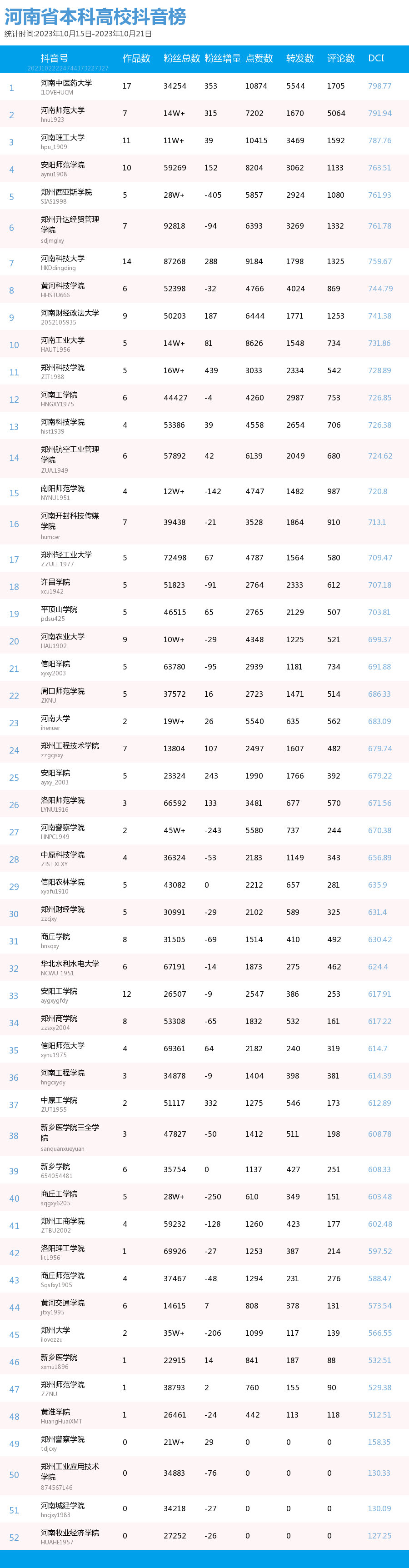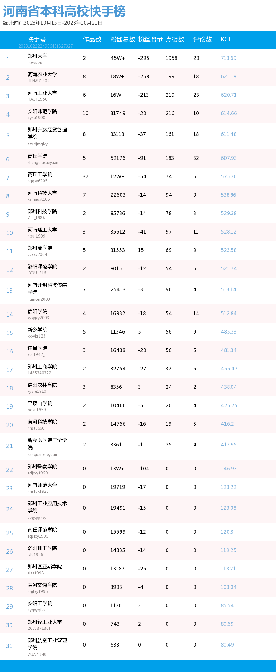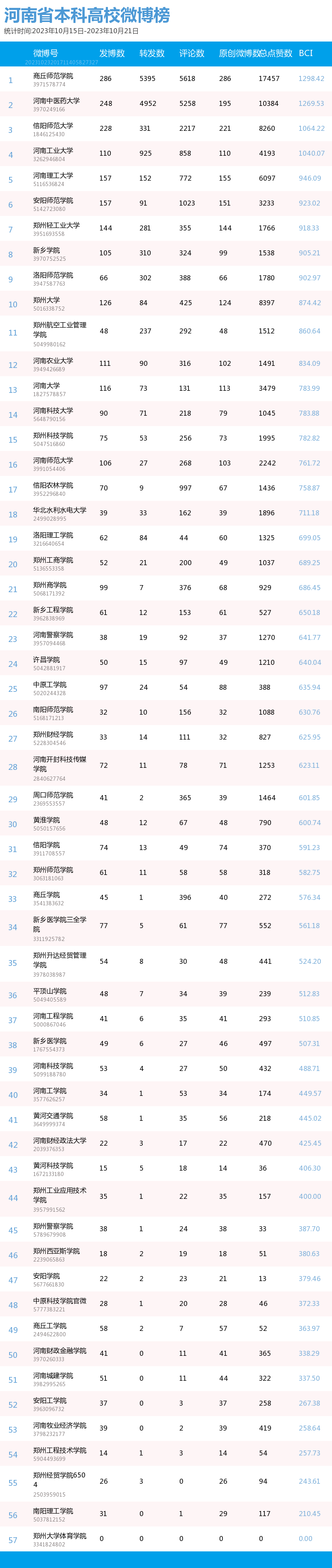 新媒 |(10.15-10.21)河南省本科院校综合传播力TOP10(附总榜)教育 | 新媒体 | 舆情 河南省教育新媒体暨舆情研究中心 河南省教育新媒体暨舆情研究中心采用第三方平台(清博指数)监测到的数据,按类别对10月15日-10月21日河南省本科院校微信、微博、抖音、快手综合传播力进行排名并整理发布。 河南省本科院校官方微信WCI ![]() 本周河南省本科院校官方微信WCI TOP10 ![]() 本周河南省本科院校官方微信热文 TOP10 本周本科高校微信榜整体数据与上周相比有所上升。其中,河南中医药大学位居榜首,WCI指数为1123.49。郑州大学和安阳师范学院分别以1014.94和981.82的WCI位居榜单第二和第三,值得各大高校学习。其中,安阳师范学院近两周持续平稳前进,值得表扬。本周各高校文章阅读量相比上周有所进步,各校可以根据学生需求,制作输出多元化内容,在保持热度和流量的同时,增加受众粘性,进一步提高文章的影响力。 在热文方面,本周河南中医药大学发布的《河南中医药大学65周年校庆公告(第三号)》介绍了郑州市人民政府与河南中医药大学联合举办首届仲景中原中医药文化节暨河南中医药大学建校65周年创新发展论坛开幕式的相关活动内容。该文章内容精简,重点突出,文本与图片相结合使信息更加清晰明了。文章最后将参与活动的义诊专家信息用图片的形式进行呈现,既缩短了文章体量,也便捷了受众查阅锁定信息,值得借鉴。 郑州大学发布的《投入1亿元!郑大要共建这个研究院!》吸引了41402人阅读,取得较好反响。由此说明,好的标题是成功的一半,利用感叹号加重语气,吸引读者阅读兴趣且不暴露过多重要信息,部分高校可学习参考。文章风格简洁,内容突出,将主要内容用蓝色加粗标注,提高读者阅读感受的同时,表现出郑州大学对于河南省创新驱动、科教兴省、人才强省战略部署的支持,同时在一定程度上增强了郑大学子对于母校的自豪感。 河南大学发布的《河大向您发出邀请!相约10月21日!》也收获了较多关注,该文章以2024届毕业生秋季就业双选会为基点,邀请用人单位与相关同学参与。内容分三个板块阐述,直观清晰,同时把握了当代大学生较为关注的就业问题,增加了阅读量和传播度。聚焦时代热点,把握读者心理,是公众号文章制作需要考虑的两大问题,也是该文章是否能够拥有高热度的关键。 总体而言,本周热文榜数据呈上升趋势,值得表扬。本周推文内容主要为校庆生日与校园重大事件这两种类型,公众号如今作为联络学生与学校之间的重要工具,此类文章拥有告知学生信息这一作用的同时,还具有提高学校影响力、推动学校进步的作用。希望各高校能够继续将视点聚焦于学生需要,总结经验,加强创新,再接再励。 河南省本科院校官方微博BCI ![]() 本周河南省本科院校官方微博BCI TOP10 河南省本科院校官方抖音DCI ![]() 本周河南本科院校官方抖音DCI TOP10 河南省本科院校官方快手KCI ![]() 本周河南本科院校官方快手KCI TOP10 附总榜: ![]() 本周河南省本科院校官方微信WCI 总榜 ![]() 本周河南省本科院校官方微博BCI 总榜 ![]() 本周河南省本科院校官方抖音DCI 总榜 ![]() 本周河南省本科院校官方快手KCI 总榜 璀 萱|统筹 李 清|作者 李 娜|校对 “豫教舆媒”是河南省教育新媒体暨舆情研究中心官方公众号,围绕教育领域开展新媒体传播研究、热点舆情深度分析,提供年度新媒体白皮书、年度舆情总结报告、新媒体排行榜等,开展地方单位培训交流、新媒体学生作品大赛等活动,致力于提供专业学习平台、服务社会发展进步,期待“豫”见您!