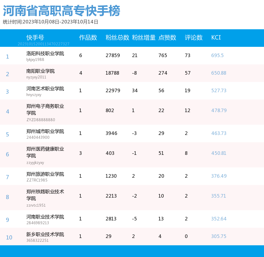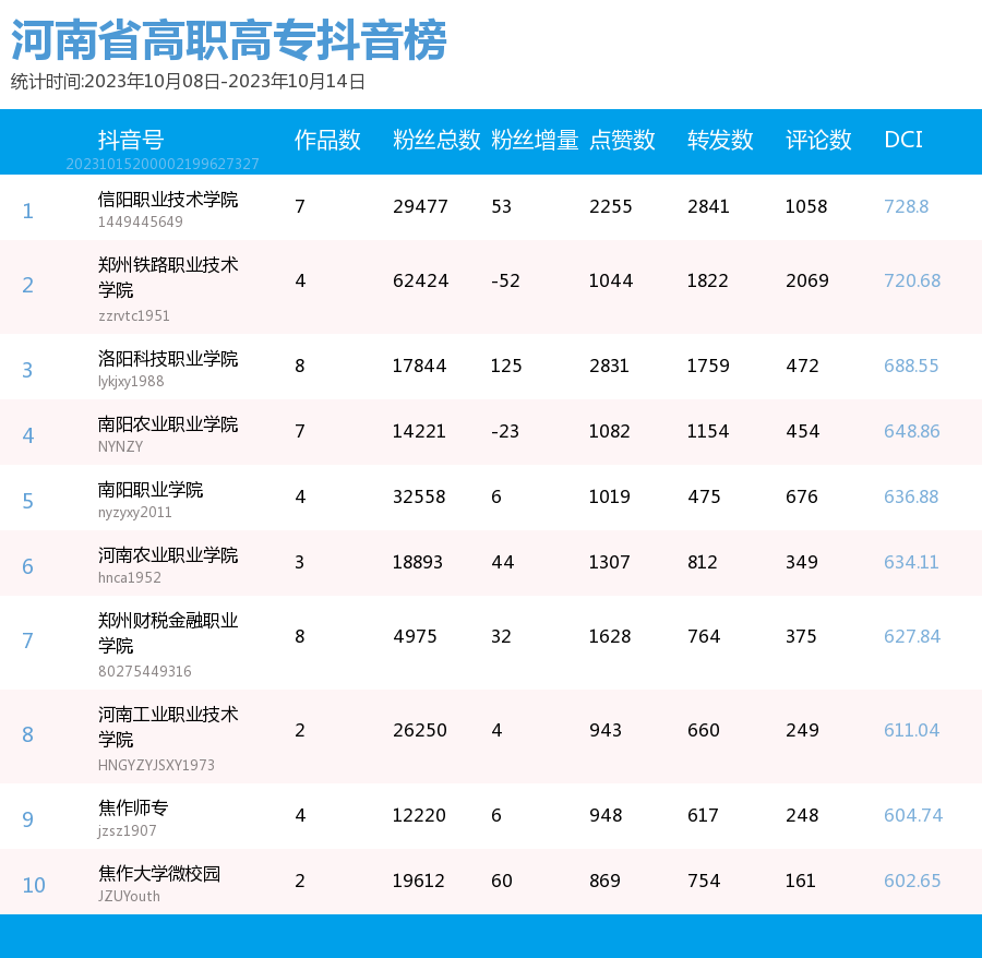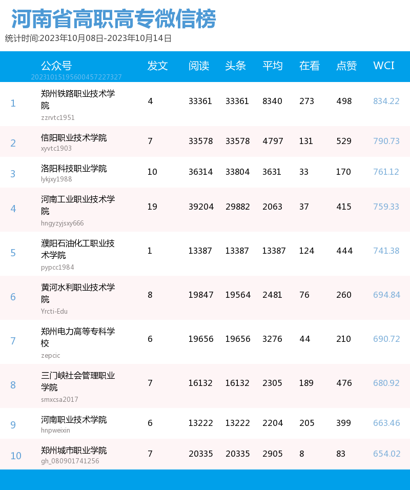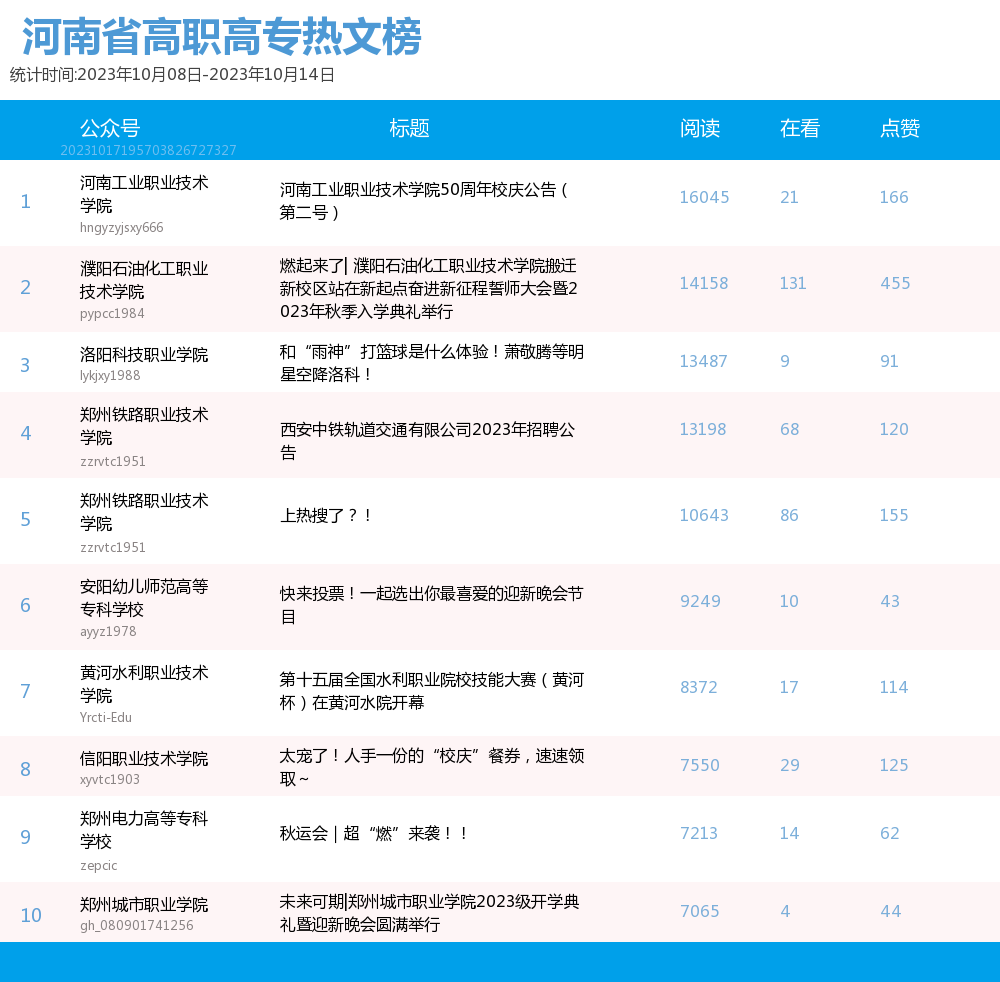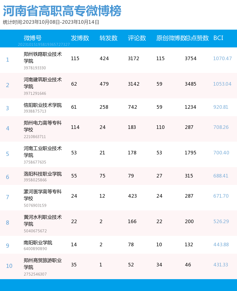 新媒 |(10.08-10.14)河南省高职高专院校综合传播力TOP10(附总榜)教育 | 新媒体 | 舆情 河南省教育新媒体暨舆情研究中心 河南省教育新媒体暨舆情研究中心采用第三方平台(清博指数)监测到的数据,按类别对10月8日—10月14日河南省高职高专院校的微信、微博、抖音、快手综合传播力进行排名并整理发布。 河南省高职高专院校官方微信WCI ![]() 本周河南省高职高专院校官方微信 TOP10 ![]() 本周河南省高职高专院校官方微信热文 TOP10 本周高职高专微信榜数据较上周整体数据而言有明显上升。其中,位列榜首的郑州铁路职业技术学院的WCI指数为834.22。信阳职业技术学院和洛阳职业技术学院分别以790.73和761.12的WCI指数位列榜单第二与第三。在数据变化方面,河南工业职业技术学院WCI指数排名有较大提高,数据位于第一,值得表扬。希望各高校能多总结、多反思,扬长避短,不断进步,创作出更多内容和热度兼具的优秀文章。 热文方面,本周热度最高的文章是河南工业职业技术学院的《河南工业职业技术学院50周年校庆公告(第二号)》。标题开门见山,直接点明了文章的公告性质。文章以图片为主体,随着图片的展示,读者们也逐渐了解了校庆活动的过程,亲切地欢迎所有校友返校参加校庆。 郑州铁路职业技术学院的《上热搜了?!》一文用简短但贴切的标题吸引了同学们的注意。推文主要介绍了郑州铁路职业技术学院在双节期间,发生的热点事件,包括假期内铁院学子游览的大好河山,家乡的特色美食,同时也借此机会介绍了铁院的文化和美景,展示了铁院学子学习和运动的形象。文章通俗易懂,贴近学子生活,在亲近同学的同时也介绍了学校和学生生活面貌。 濮阳石油化工职业技术学院的《燃起来了|濮阳石油化工职业技术学院搬迁新校区站在新起点奋进新征程誓师大会暨2023年秋季入学典礼举行》是一篇通告。主要介绍了这次大会的主要内容,总结了学校领导在大会上的讲话内容,还有各个学生代表的讲话内容。总体内容偏向于总结,展示了学校的新学期新气象。 正值中秋国庆双节长假结束,各高校的推文主题多围绕返校问题展开。由于该主题自带的热度,文章获得了大批读者关注,也取得了不错的阅读成绩。总体而言,许多高校的文章较上周相比都取得了一定的进步,值得肯定。但也有少部分高校内容创作不够积极,没有抓住同学们关心的热点,导致公众号运营效果不理想。希望各高校能够吸取之前的经验教训,多总结、多思考,进行更多更优质的创作探索,精准定位符合各类读者的需求,找寻自身院校特色风格,创作更有意义、更具有传播力的作品。 河南省高职高专院校官方微博BCI ![]() 本周河南省高职高专院校官方微博BCI TOP10 河南省高职高专院校官方抖音DCI ![]() 本周河南省高职高专院校官方抖音DCI TOP10 河南省高职高专院校官方快手KCI ![]() 本周河南省高职高专院校官方快手KCI TOP10 附总榜: ![]() 本周河南省高职高专院校官方微信WCI 总榜 ![]() 本周河南省高职高专院校官方微博BCI 总榜 ![]() 本周河南省高职高专院校官方抖音DCI 总榜 ![]() 本周河南省高职高专院校官方快手KCI 总榜 璀 萱 | 统筹 虞梦轩 | 作者 白雨柔 | 校对 “豫教舆媒”是河南省教育新媒体暨舆情研究中心官方公众号,围绕教育领域开展新媒体传播研究、热点舆情深度分析,提供年度新媒体白皮书、年度舆情总结报告、新媒体排行榜等,开展地方单位培训交流、新媒体学生作品大赛等活动,致力于提供专业学习平台、服务社会发展进步,期待“豫”见您!