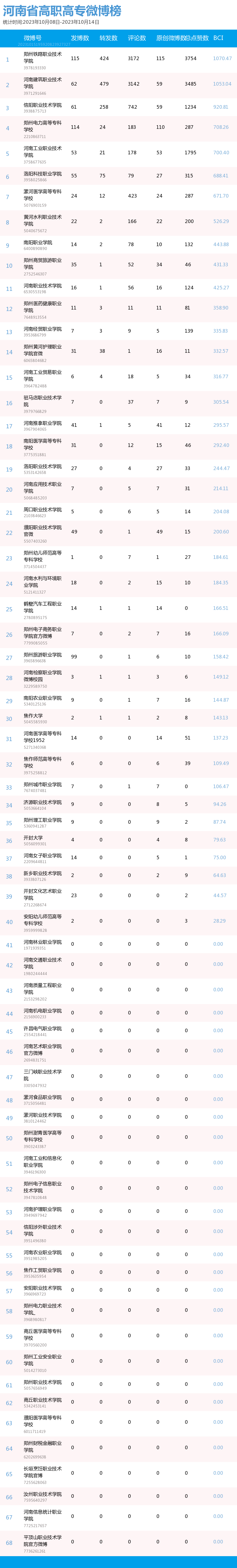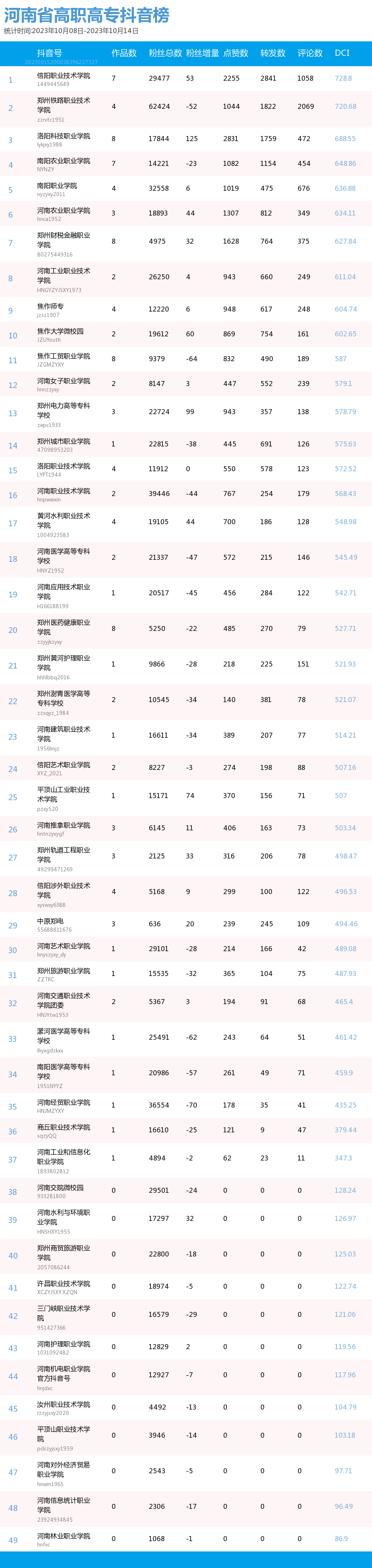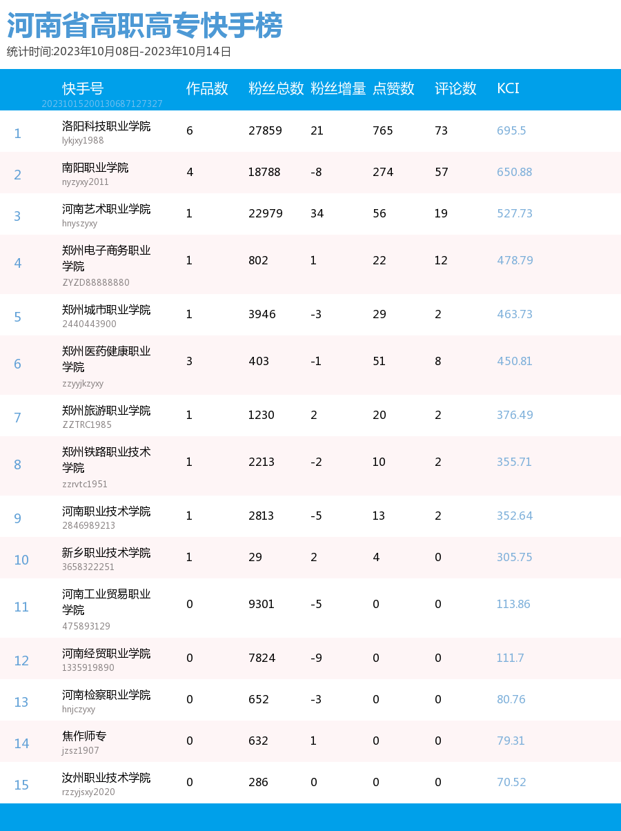 新媒 |(10.08-10.14)河南省高职高专院校综合传播力TOP10(附总榜)教育 | 新媒体 | 舆情 河南省教育新媒体暨舆情研究中心 河南省教育新媒体暨舆情研究中心采用第三方平台(清博指数)监测到的数据,按类别对10月8日—10月14日河南省高职高专院校的微信、微博、抖音、快手综合传播力进行排名并整理发布。 河南省高职高专院校官方微信WCI ![]() 本周河南省高职高专院校官方微信 TOP10 ![]() 本周河南省高职高专院校官方微信热文 TOP10 本周高职高专微信榜数据较上周整体数据而言有明显上升。其中,位列榜首的郑州铁路职业技术学院的WCI指数为834.22。信阳职业技术学院和洛阳职业技术学院分别以790.73和761.12的WCI指数位列榜单第二与第三。在数据变化方面,河南工业职业技术学院WCI指数排名有较大提高,数据位于第一,值得表扬。希望各高校能多总结、多反思,扬长避短,不断进步,创作出更多内容和热度兼具的优秀文章。 热文方面,本周热度最高的文章是河南工业职业技术学院的《河南工业职业技术学院50周年校庆公告(第二号)》。标题开门见山,直接点明了文章的公告性质。文章以图片为主体,随着图片的展示,读者们也逐渐了解了校庆活动的过程,亲切地欢迎所有校友返校参加校庆。 郑州铁路职业技术学院的《上热搜了?!》一文用简短但贴切的标题吸引了同学们的注意。推文主要介绍了郑州铁路职业技术学院在双节期间,发生的热点事件,包括假期内铁院学子游览的大好河山,家乡的特色美食,同时也借此机会介绍了铁院的文化和美景,展示了铁院学子学习和运动的形象。文章通俗易懂,贴近学子生活,在亲近同学的同时也介绍了学校和学生生活面貌。 濮阳石油化工职业技术学院的《燃起来了|濮阳石油化工职业技术学院搬迁新校区站在新起点奋进新征程誓师大会暨2023年秋季入学典礼举行》是一篇通告。主要介绍了这次大会的主要内容,总结了学校领导在大会上的讲话内容,还有各个学生代表的讲话内容。总体内容偏向于总结,展示了学校的新学期新气象。 正值中秋国庆双节长假结束,各高校的推文主题多围绕返校问题展开。由于该主题自带的热度,文章获得了大批读者关注,也取得了不错的阅读成绩。总体而言,许多高校的文章较上周相比都取得了一定的进步,值得肯定。但也有少部分高校内容创作不够积极,没有抓住同学们关心的热点,导致公众号运营效果不理想。希望各高校能够吸取之前的经验教训,多总结、多思考,进行更多更优质的创作探索,精准定位符合各类读者的需求,找寻自身院校特色风格,创作更有意义、更具有传播力的作品。 河南省高职高专院校官方微博BCI ![]() 本周河南省高职高专院校官方微博BCI TOP10 河南省高职高专院校官方抖音DCI ![]() 本周河南省高职高专院校官方抖音DCI TOP10 河南省高职高专院校官方快手KCI ![]() 本周河南省高职高专院校官方快手KCI TOP10 附总榜: ![]() 本周河南省高职高专院校官方微信WCI 总榜 ![]() 本周河南省高职高专院校官方微博BCI 总榜 ![]() 本周河南省高职高专院校官方抖音DCI 总榜 ![]() 本周河南省高职高专院校官方快手KCI 总榜 璀 萱 | 统筹 虞梦轩 | 作者 白雨柔 | 校对 “豫教舆媒”是河南省教育新媒体暨舆情研究中心官方公众号,围绕教育领域开展新媒体传播研究、热点舆情深度分析,提供年度新媒体白皮书、年度舆情总结报告、新媒体排行榜等,开展地方单位培训交流、新媒体学生作品大赛等活动,致力于提供专业学习平台、服务社会发展进步,期待“豫”见您!