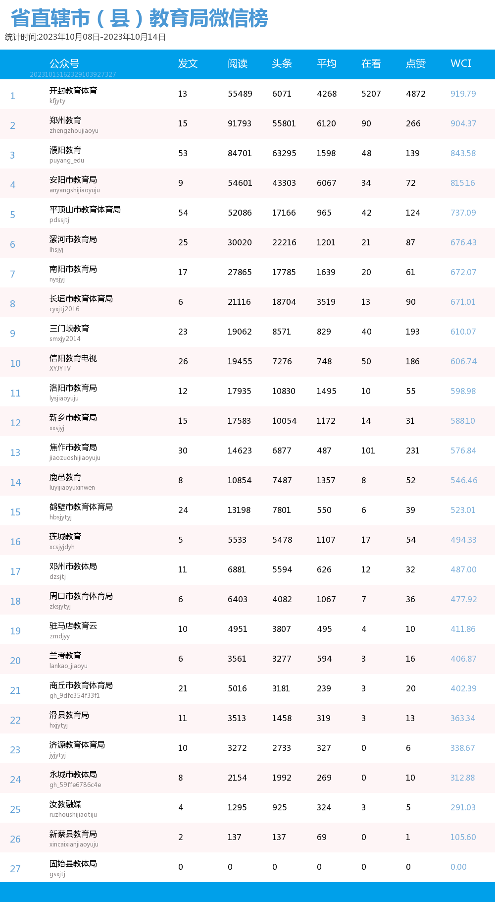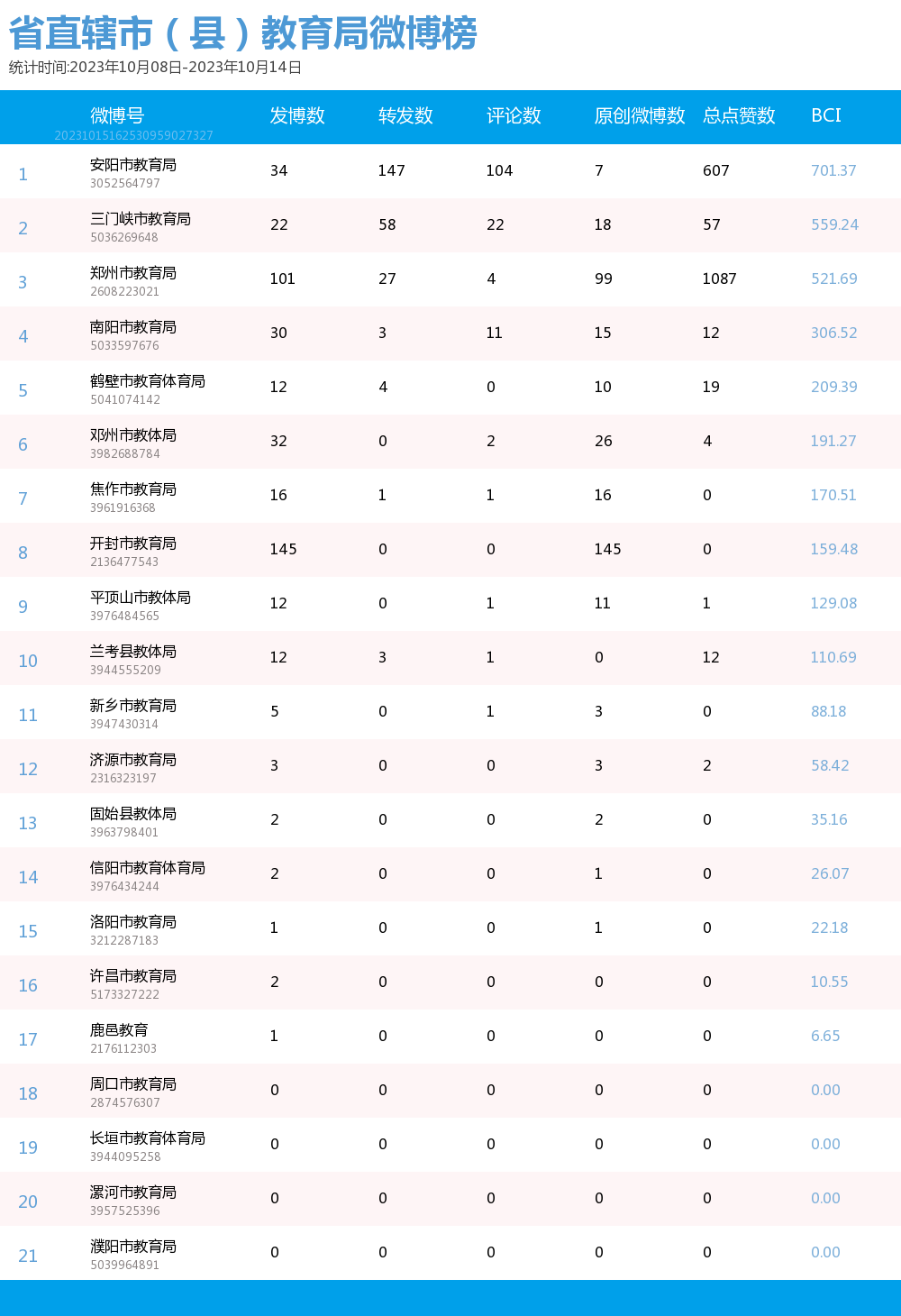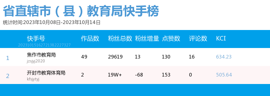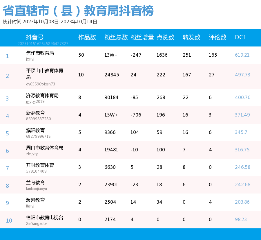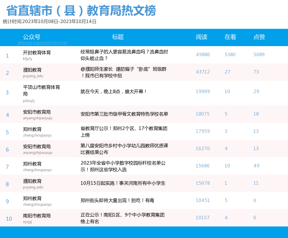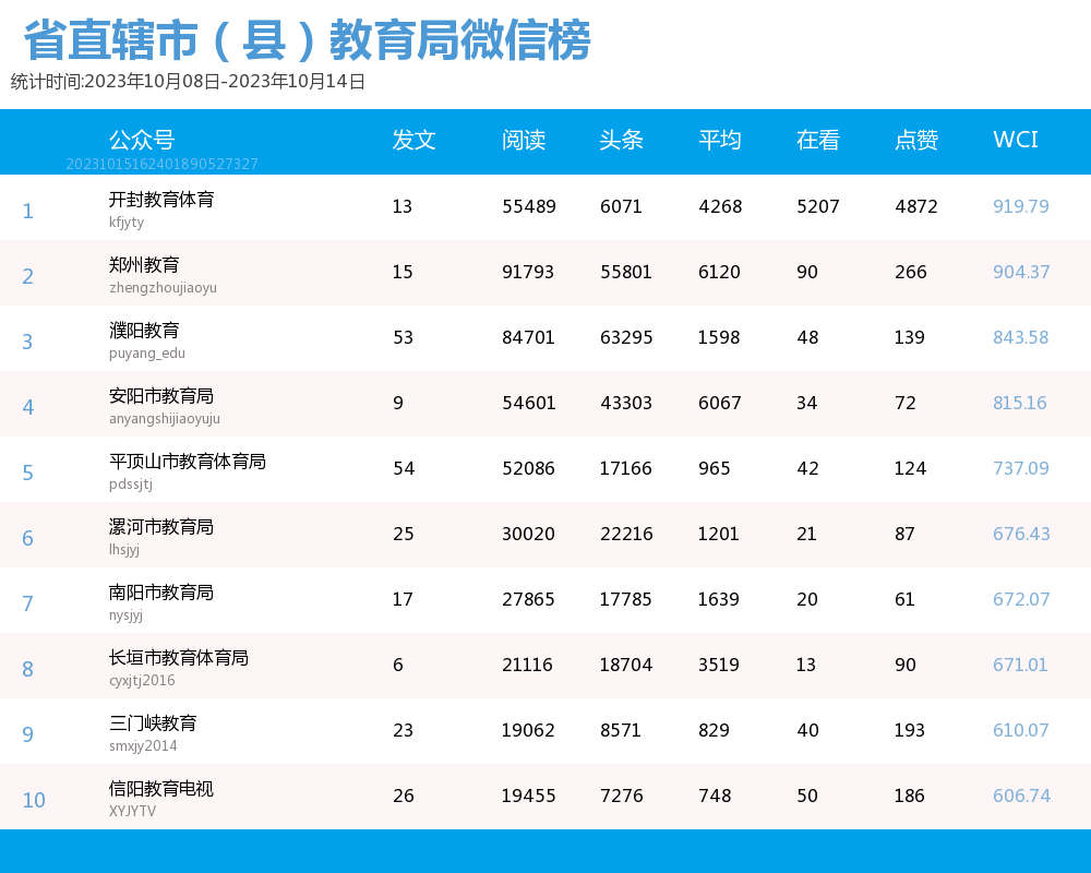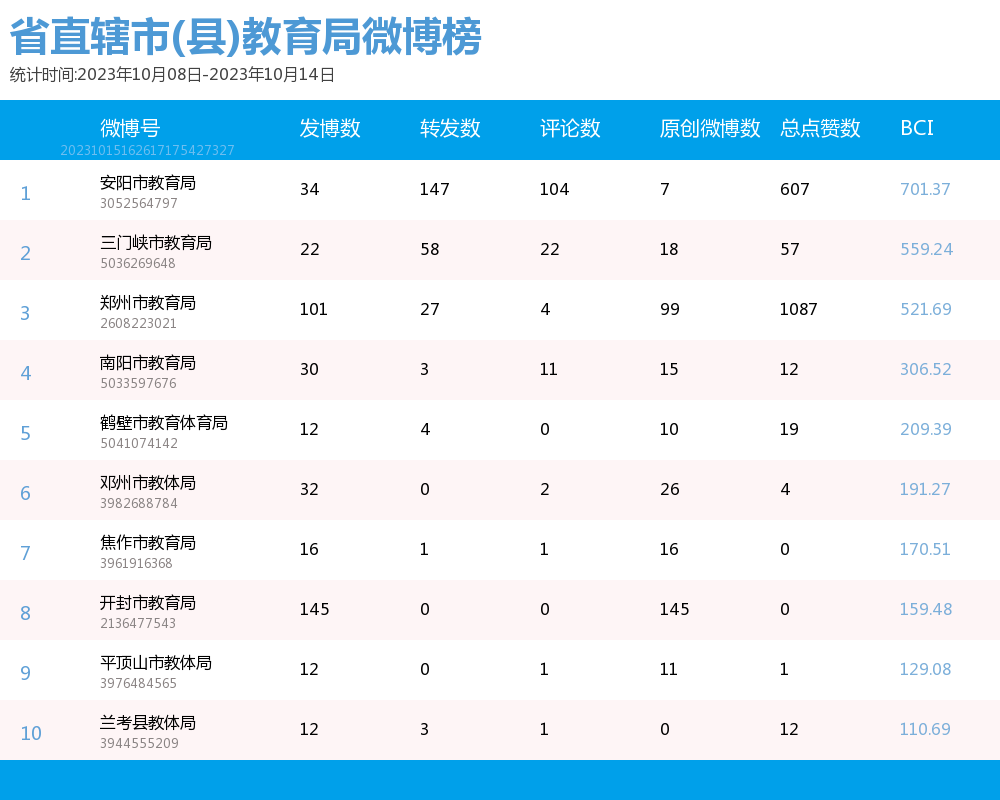 新媒 |(10.8-10.14)河南省地市(县)教育局综合传播力TOP10(附总榜)教育 | 新媒体 | 舆情 河南省教育新媒体暨舆情研究中心 河南省教育新媒体暨舆情研究中心采用第三方平台(清博指数)监测数据,按类别对10月8日-10月14日河南省地市(县)教育局微信、微博、抖音、快手的综合传播力进行排名并整理发布。 省直辖市(县)教育局官方微信WCI ![]() 本周河南省直辖市(县)教育局官方微信WCI TOP10 ![]() 本周河南省直辖市(县)教育局官方微信热文 TOP10 本周榜单中,河南省直辖市(县)教育局微信榜的文章总数和阅读量等数据方面大幅提升。其中,开封教育体育以919.79的WCI指数荣登榜单第一,值得学习。郑州教育以904.37的WCI指数紧随其后,位于榜单第二。濮阳教育以843.58的WCI指数居榜单第三,对比上周排名进步显著。在本周各单位的创作质量和创作积极性都有很大提升。望各单位继续保持创作积极性,再接再励,稳中求进,提供更有价值的文章。 在热文方面,开封教育体育的《经常抠鼻子的人更容易流鼻血吗?流鼻血是仰头能止血?》经发布获得了4W+的阅读量,位居热文榜第一。文章为读者科普了流鼻血时正确的止血方式,让读者在日常的阅读间丰富知识。内容上,采用选择题的方式增强了读者的参与感;排版上,题目采用两个问号,并且在文章开头抛出问题,吸引读者的阅读兴趣,后又提出相应的解决办法,简单易懂。开封教育体育作为发声者不仅关心学校教育问题,还关心学生们的身体健康,值得各单位学习。 濮阳教育紧扣社会热点“网络诈骗”,发布文章《@濮阳师生家长 谨防骗子“卧底”班级群!我市已有学校中招》,一经发布就获得了43712的阅读量,位居热文榜第二。文章开头就用红色的“警惕”二字提醒各位师生家长不要掉入骗子的陷阱,其次在正文中采用三个板块分别对班主任防骗、家长防骗和警方提醒做了详细的介绍,并且在文章中对于防骗措施都进行了蓝色的标注,更加醒目。 平顶山市第十一届运动会开幕,平顶山市教育体育局就此发表的文章《就在今天,晚上八点,盛大开幕》位居热文榜第三,阅读量达到了19909。文章对开幕式的阵容,吉祥物,观看方式等各方面都做了详细的介绍。同时在文章的结尾还贴心的为我们提供了一份开幕式节目单,让观众更加清楚整个开幕式的流程,给观众带来更好的观看体验。习近平总书记曾多次强调全民运动的重要性,这次运动会开幕式展现了平顶山市的风采,让我们认识了一个充满活力的城市。 总体而言,本周各单位密切关注师生家长的生命财产安全,体现了各单位对人民生活的关心,展现了其人文关怀,在数据方面也获得了较好的反响。望各单位积极发掘热点问题,保持开放的心态和创作热情,发布更多与时代同频的优秀文章。 省直辖市(县)教育局官方微博BCI ![]() 本周河南省直辖市(县)教育局官方微博BCI TOP10 省直辖市(县)教育局官方抖音DCI ![]() 本周河南省直辖市(县)教育局官方抖音DCI TOP10 省直辖市(县)教育局官方快手KCL ![]() 本周河南省直辖市(县)教育局官方快手KCI TOP10 附总榜: ![]() 本周河南省直辖市(县)教育局官方微信WCI 总榜 ![]() 本周河南省直辖市(县)教育局官方微博BCI 总榜 ![]() 本周河南省直辖市(县)教育局官方抖音DCI 总榜 ![]() 本周河南省直辖市(县)教育局官方快手KCI 总榜 璀 萱|统筹 孙亦坤|作者 白雨柔|校对 “豫教舆媒”是河南省教育新媒体暨舆情研究中心官方公众号,围绕教育领域开展新媒体传播研究、热点舆情深度分析,提供年度新媒体白皮书、年度舆情总结报告、新媒体排行榜等,开展地方单位培训交流、新媒体学生作品大赛等活动,致力于提供专业学习平台、服务社会发展进步,期待“豫”见您!
